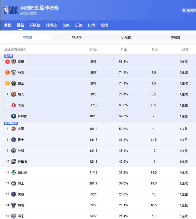 西部最新排名: