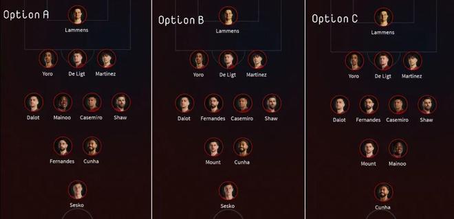 预测曼联非洲杯期间阵容:塞纳·拉门斯/莱尼·约罗(马奎尔),德里赫特(马奎尔埃登·海文),卢克·肖(利桑德罗·马丁内斯)/迪奥古·达洛,卡塞米罗,布鲁诺·费尔南德斯,帕特里克·多古/梅森·芒特(梅诺),谢什科(齐尔克泽),库尼亚。
